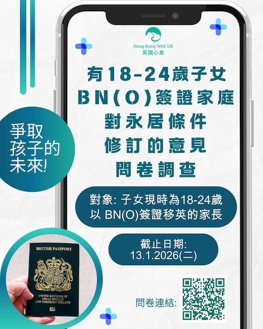 英國心泉第二階段永居條件修訂問卷調查今日正式開始,今次對象是有18-24歲子女的BN(O)簽證家長。