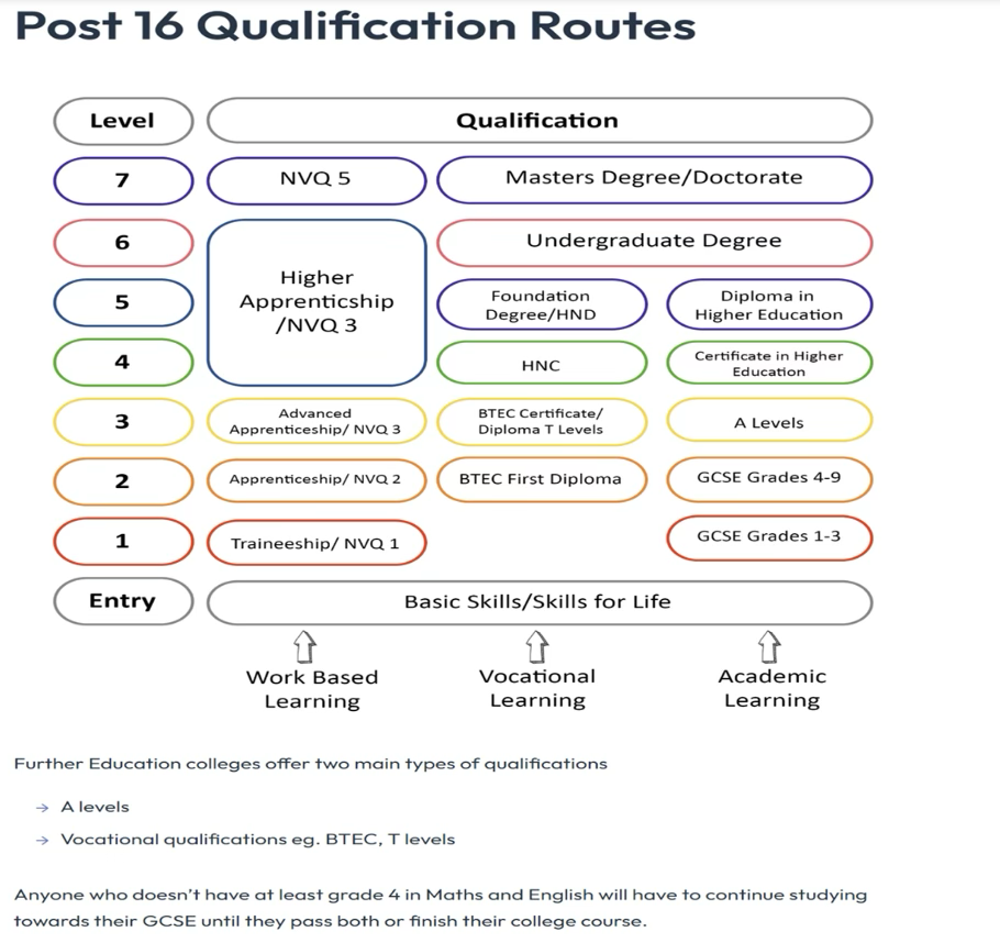 對不少香港家庭來說,讀GCSE讀A level再讀大學,好像這條就是唯一的路。而英國的年青人則會考量不同的出路,學校也不只會介紹大學課程,也會介紹學徒課程等。我們很多時只聚焦大學學位,但同為資歷架構Level 6的其實還有Higher Apprenticeship (見圖2)而升讀大學除了透過較熟悉的A Level及 Foundation Degree外,還可透過Diploma in Higher Education、HNC/HND課程。