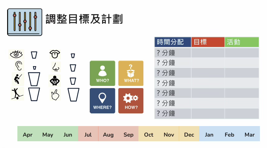 小朋友的狀態是會變化的,因著家長的努力,小朋友的感覺統合能力會逐漸成熟;訓練前,有些小朋友是感官過敏的,但你願意抽時間、花心機和他做訓練,他會小步走路,由「膽怯地嘗試」步向「喜歡」玩,甚至變成「尋求」,所以家長要一直觀察小朋友的反應而調整訓練目標。