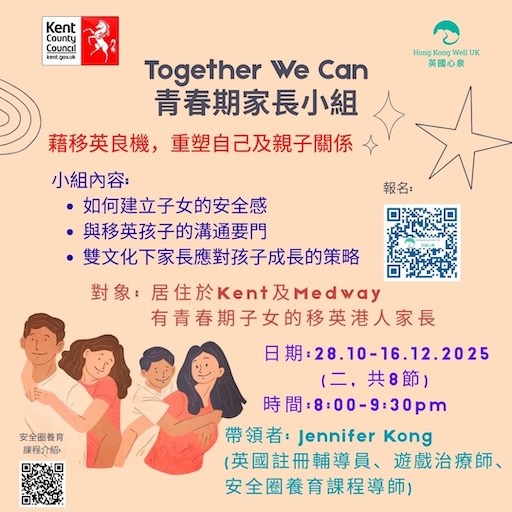 英國心泉為Kent及Medway有青春期子女嘅移英港人家長,特設以下小組,同大家一齊藉移英良機,重塑自己及親子關係